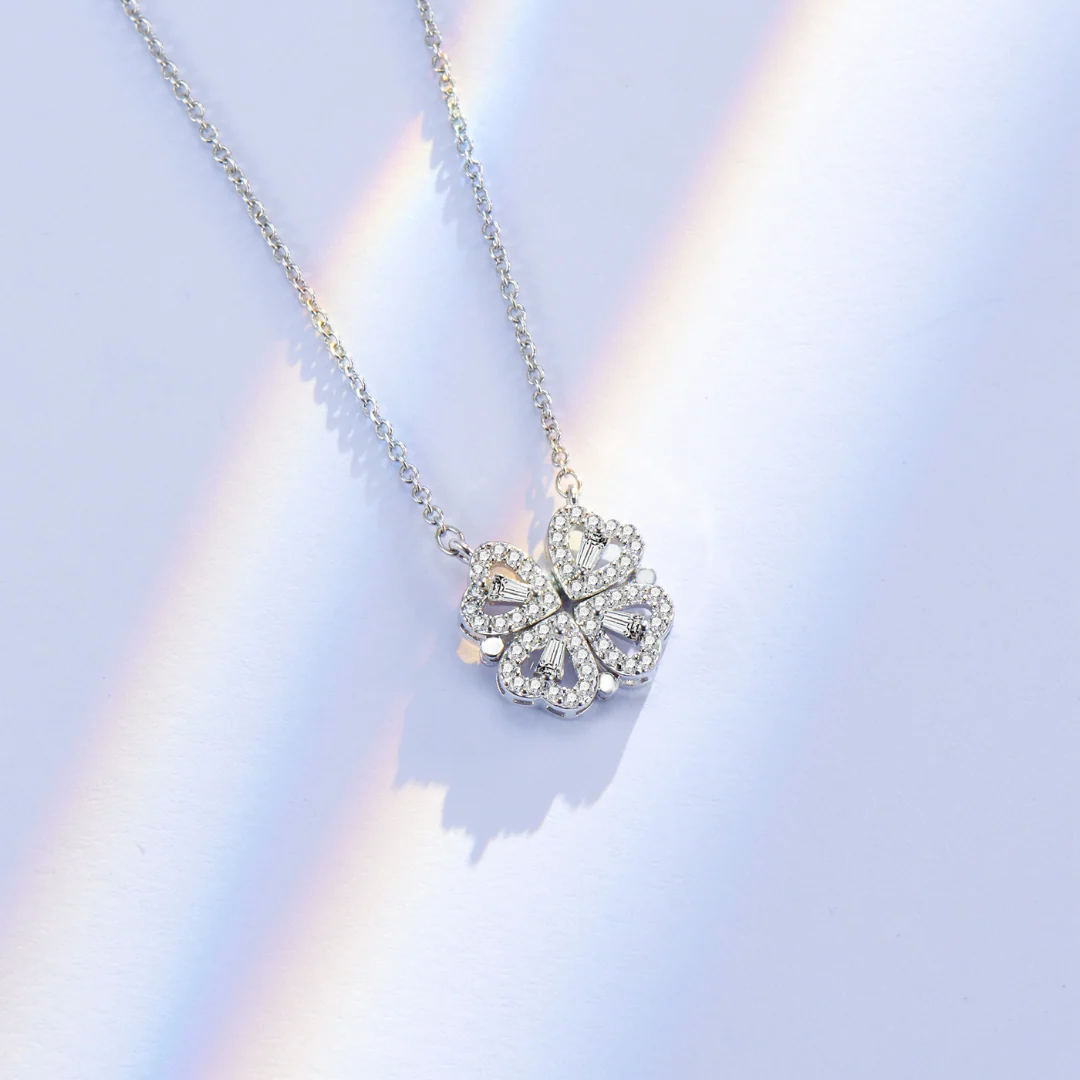 The Necklace can be worn in 2 ways: lucky Clover and romantic four Hearts. The pendant magnetically joins the hearts into the clover